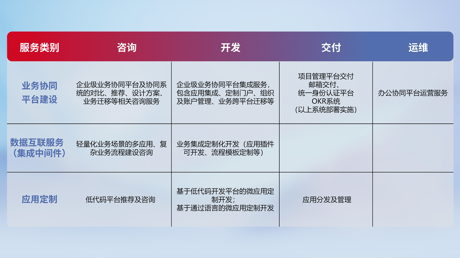 针对钉钉、、企微、、、IDaas等平台级产品提供产品的规划、、、、方案、、交付、、、定制化开发等服务,,,实现如统一协同办公、、、智能客户服务、、、、混合会议管理、、、智能数据查询、、、、等业务场景,,实现数字化转型。。