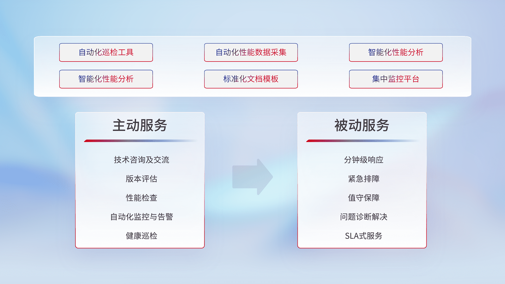 智能化工具和标准化文档,,,,保障服务质量,,,,提供主动服务(包含技术咨询、、、版本评估、、、、性能检查、、自动化监控与告警、、、、健康巡检)和被动服务包含(分钟级响应、、紧急排障、、值守保障、、问题诊断解决、、、、SLA服务)。。